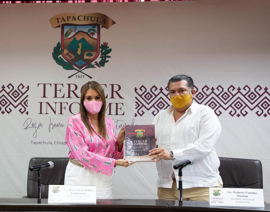 En sesión solemne de Cabildo y cumpliendo con lo estipulado en la Ley de Desarrollo Constitucional en Materia de Gobierno y Administración Municipal del Estado de Chiapas, del Bando de Policía y Gobierno del Municipio de Tapachula y del Reglamento de la Administración Pública Municipal, la presidenta municipal Rosa Irene Urbina Castañeda hizo entrega del tercer informe de gobierno que será remitido al Congreso del Estado.
