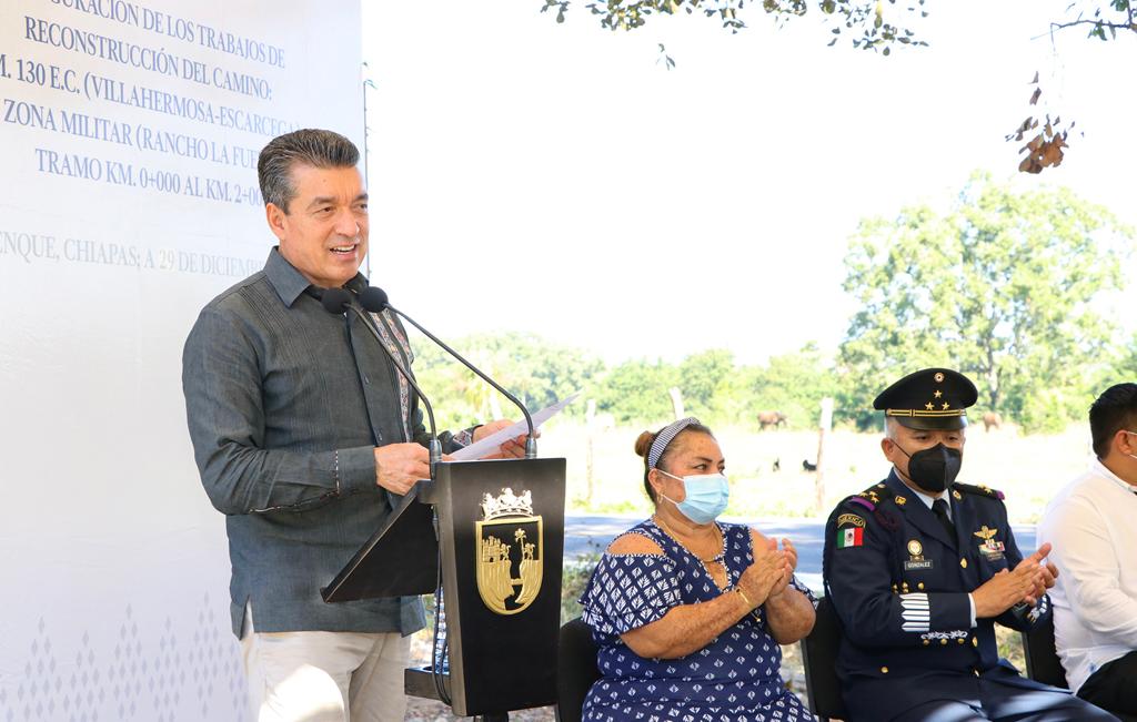 Al inaugurar la reconstrucción del camino Kilómetro 130 E.C. (Villahermosa-Escárcega)-Zona Militar (Rancho La Fuente), en el municipio de Palenque, el gobernador Rutilio Escandón Cadenas señaló que este tramo carretero, el cual había sido una añeja petición, favorece el traslado de más de tres mil habitantes de distintas rancherías, así como de quienes transitan hacia la Zona Aérea Militar.