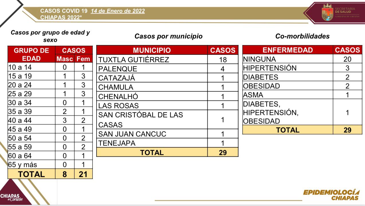 La Secretaría de Salud estatal informa que los casos recientes se reportaron en los siguientes nueve municipios: Tuxtla Gutiérrez, con 18; Palenque, cuatro; y con un contagio aparecen Catazajá, Chamula, Chenalhó, Las Rosas, San Cristóbal de Las Casas, San Juan Cancuc y Tenejapa.