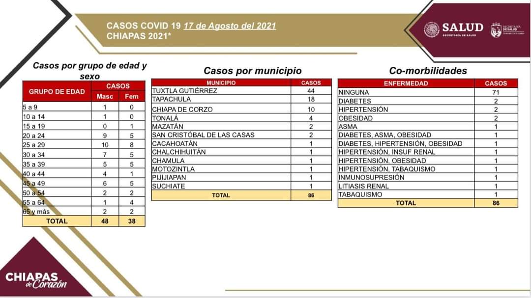 Los casos positivos se registraron en los municipios siguientes: Tuxtla Gutiérrez, 44; Tapachula, 18; Chiapa de Corzo, 10; Tonalá, cuatro; Mazatán y San Cristóbal de Las Casas, dos cada uno; y Cacahoatán, Chalchihuitán, Chamula, Motozintla, Pijijiapan y Suchiate, un contagio cada municipio.