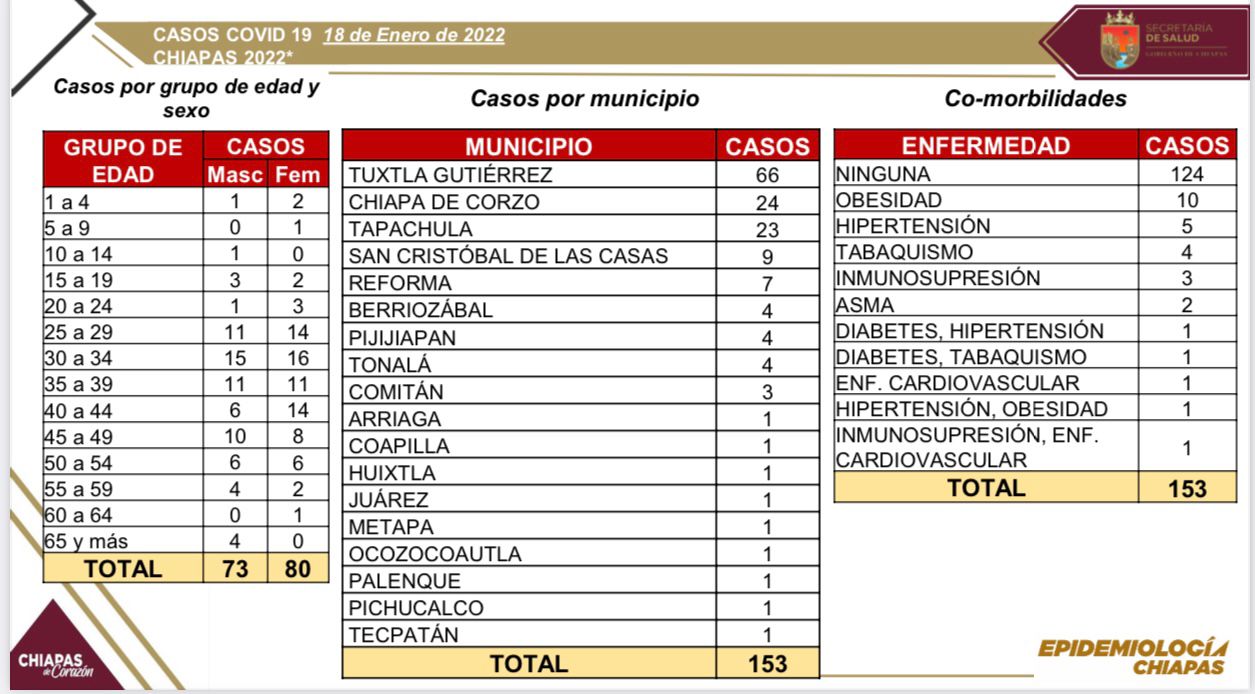 El informe diario sobre la transmisión de COVID-19 en la entidad arroja que en las últimas horas se registraron 153 casos nuevos en todos los grupos de edad y la mayoría de ellos en las ciudades de Tuxtla Gutiérrez, Chiapa de Corzo y Tapachula, da a conocer la Secretaría de Salud de Chiapas.