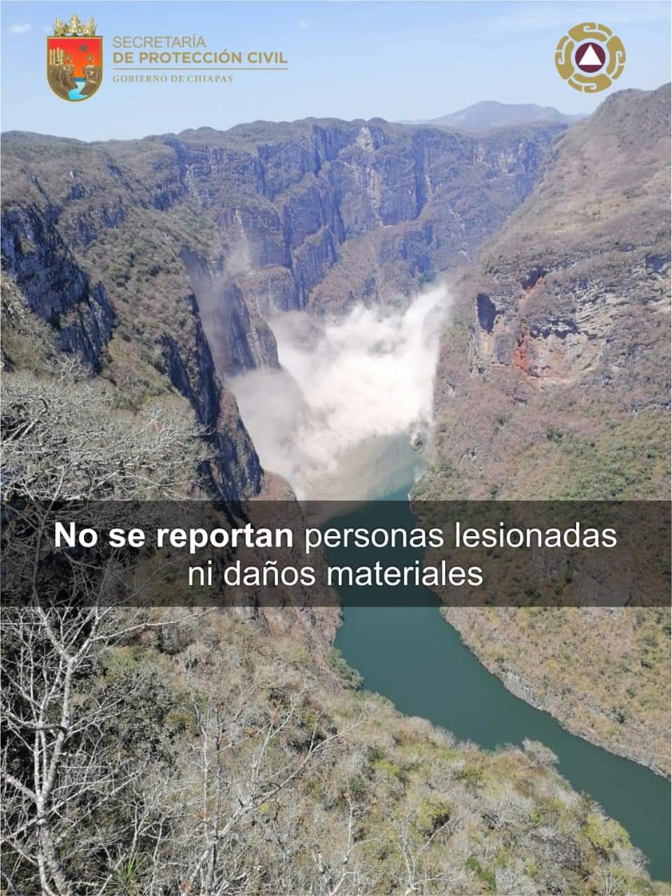 Derivado de un desprendimiento de rocas que se suscitó hace algunos momentos en una de las paredes del Parque Nacional Cañón del Sumidero, la Secretaría de #ProtecciónCivil en coordinación con la Coordinación Nacional de Áreas Naturales Protegidas (CONANP-Dirección Frontera Sur, Istmo, Pacífico Sur) y capitanía de puerto, optó de cerrar de manera preventiva la navegación.