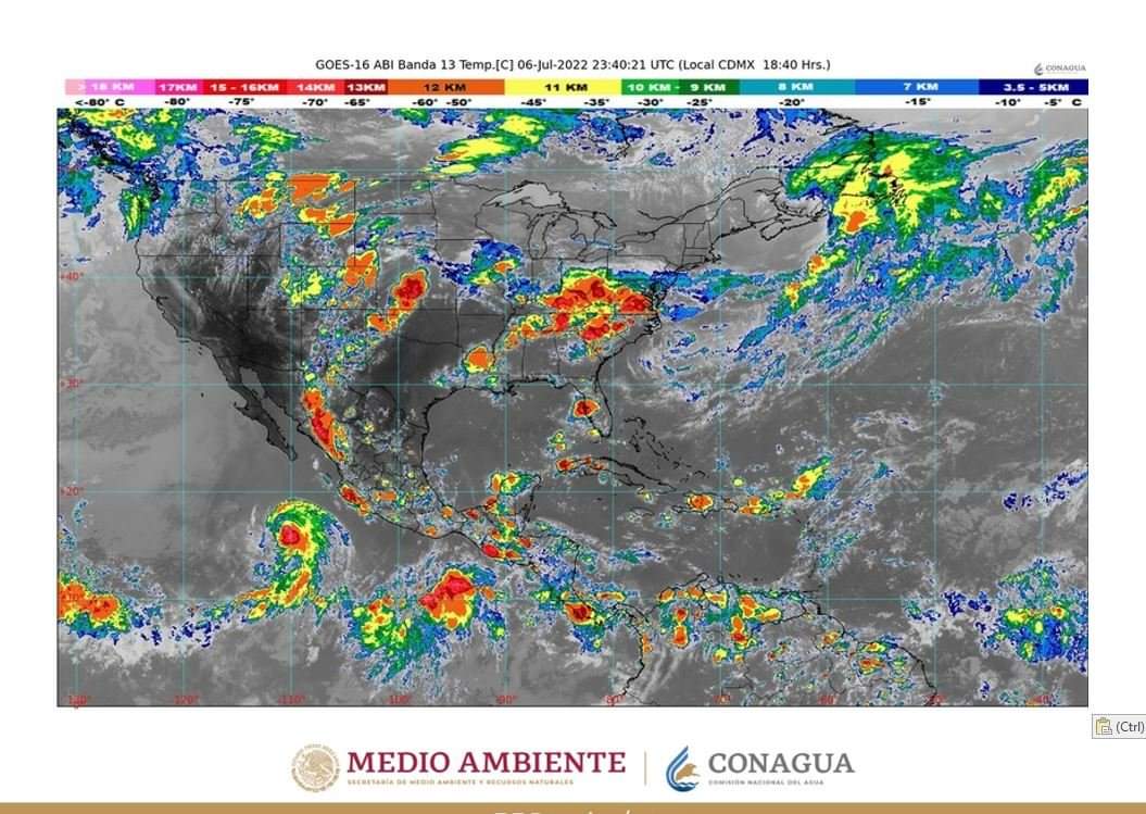 Durante la noche de hoy, miércoles, y la madrugada de mañana, jueves, el Monzón mexicano, en interacción con inestabilidad atmosférica superior, ocasionará lluvias puntuales muy fuertes (de 50 a 75 milímetros [mm]) con descargas eléctricas y posible granizo en regiones de Chihuahua, Durango y Sinaloa, y fuertes (de 25 a 50 mm) en sitios de Sonora.