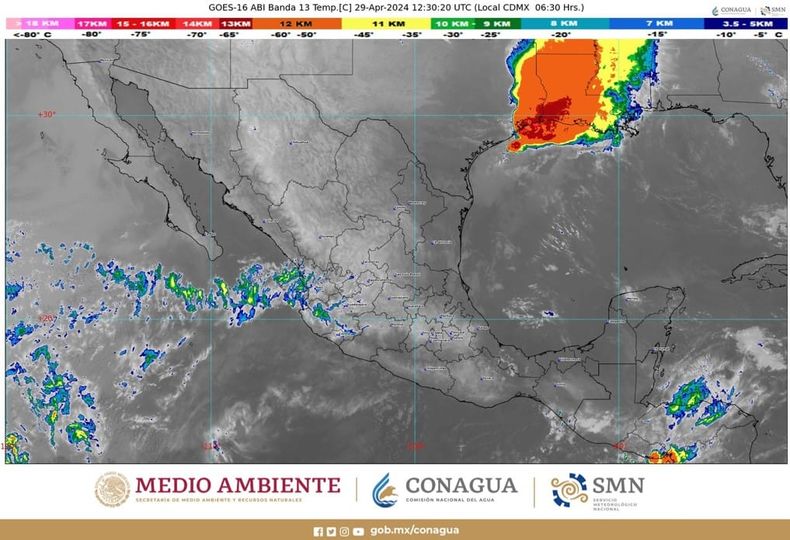 Hoy, en el transcurso del día, habrá ambiente de caluroso a muy caluroso en la mayor parte de México, con temperaturas máximas superiores a 45 grados Celsius en Campeche, Guerrero, Tabasco, sur de Veracruz y Yucatán; de 40 a 45 grados en Chiapas, Michoacán, Morelos, Nuevo León, Oaxaca, San Luis Potosí y Tamaulipas; de 35 a 40 grados en Aguascalientes, Baja California, Baja California Sur, Chihuahua, Coahuila, Colima, Durango, el suroeste del Estado de México, Guanajuato, Hidalgo, Jalisco, Nayarit, norte y suroeste de Puebla, Querétaro, Quintana Roo, Sinaloa, Sonora y Zacatecas, y de 30 a 35 grados Celsius en Tlaxcala.
