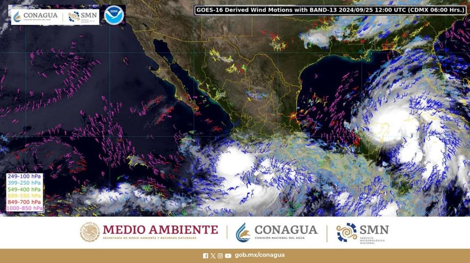 Hoy, una zona baja presión con probabilidad de desarrollo ciclónico ubicada frente a la costa limítrofe de Guerrero y Michoacán, los remanentes de John y la vaguada monzónica, mantendrán el temporal de lluvias puntuales extraordinarias (superiores a 250 milímetros [mm]) en regiones de Guerrero y Oaxaca; torrenciales (de 150 a 250 mm) en zonas de Chiapas; intensas (de 75 a 150 mm) en áreas de Puebla y Veracruz; muy fuertes (50 a 75 mm) en Michoacán, Morelos, Tabasco y Tlaxcala; fuertes (de 25 a 50 mm) en Colima, Estado de México, Hidalgo, Jalisco y Querétaro, e intervalos de chubascos (de 5 a 25 mm) en Ciudad de México y Guanajuato.