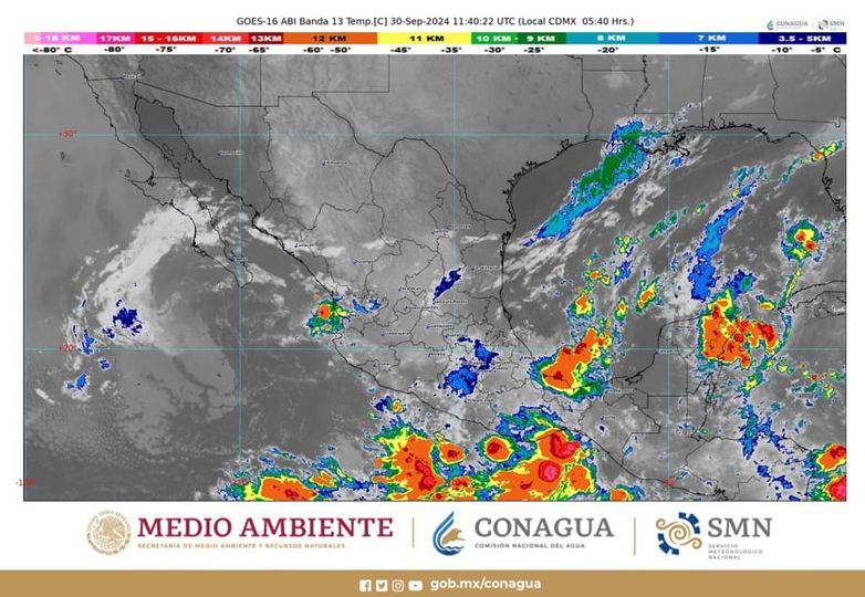 Se esperan lluvias puntuales intensas (de 75 a 150 milímetros [mm]) en Chiapas, Guerrero, Oaxaca, Tabasco y Veracruz; muy fuertes (de 50 a 75 mm) en Campeche, Colima, Jalisco, Michoacán, Puebla, Quintana Roo y Yucatán; fuertes (de 25 a 50 mm) en Ciudad de México, Estado de México, Morelos y Nayarit; intervalos de chubascos (de 5 a 25 mm) en Baja California Sur, Durango, Hidalgo, Sinaloa, Tlaxcala y Zacatecas, así como lluvias aisladas (de 0.1 a 5 mm) en Aguascalientes, Guanajuato, Querétaro y San Luis Potosí.