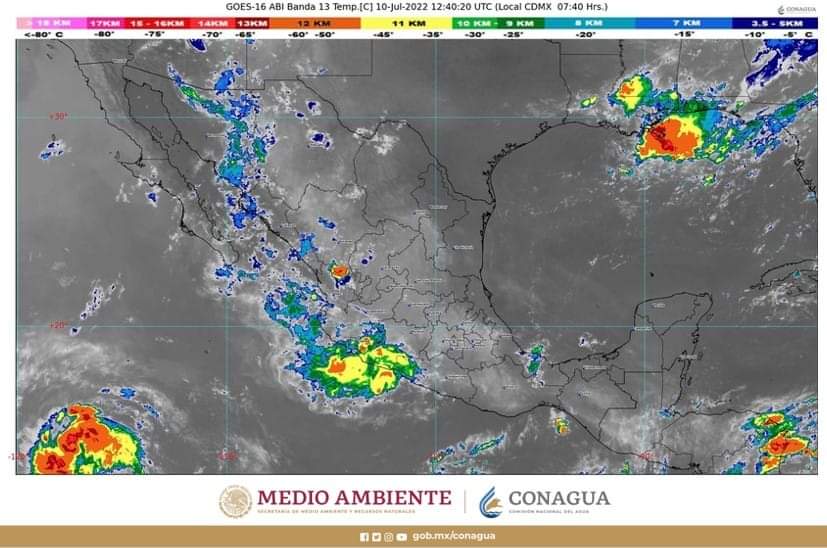 Este domingo, canales de baja presión sobre la sierra Madre Occidental, la Península de Yucatán y el centro y sur de México, en interacción con inestabilidad en la parte alta de la atmósfera y el paso de la Onda Tropical Número 10 por el sureste y sur del país, provocarán lluvias muy fuertes (de 50 a 75 milímetros [mm]) en Chiapas y Oaxaca; fuertes (de 25 a 50 mm) en Campeche, Chihuahua, Colima, Guerrero, Jalisco, Michoacán, Morelos, Nayarit, Puebla, Quintana Roo, Sinaloa, Sonora, Tabasco, Veracruz y Yucatán; chubascos (de 5 a 25 mm) en la Ciudad de México, Durango y Estado de México, y lluvias aisladas (de 0.1 a 5 mm) en Baja California Sur, Coahuila, Hidalgo, Nuevo León, Querétaro, San Luis Potosí, Tamaulipas, Tlaxcala y Zacatecas.