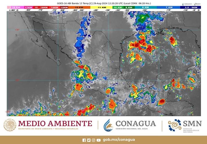 Hoy, se esperan lluvias puntuales intensas (de 75 a 150 milímetros [mm]) en Chiapas Guerrero y Oaxaca; muy fuertes (de 50 a 75 mm) en Estado de México, Colima, Guanajuato, Jalisco y Michoacán; fuertes (de 25 a 50 mm) en Campeche, Chihuahua, Coahuila, Ciudad de México, Durango, Hidalgo, Morelos, Nayarit, Nuevo León, Puebla, Querétaro, Quintana Roo, Sinaloa, Sonora, Tabasco, Tamaulipas, Tlaxcala, Veracruz y Yucatán; intervalos de chubascos (de 5 a 25 mm) en Aguascalientes, Baja California Sur, San Luis Potosí y Zacatecas, y lluvias aisladas (de 0.1 a 5 mm) en Baja California.