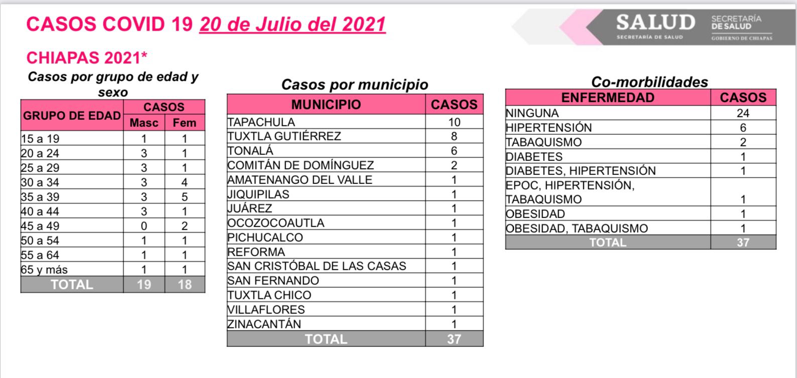 La Secretaría de Salud del estado da a conocer que los contagios nuevos se registraron de la siguiente manera: Tapachula, 10; Tuxtla Gutiérrez, ocho; Tonalá, seis; Comitán, dos; y con un caso los municipios de Amatenango del Valle, Jiquipilas, Juárez, Ocozocoautla, Pichucalco, Reforma, San Cristóbal de Las Casas, San Fernando, Tuxtla Chico, Villaflores y Zinacantán.