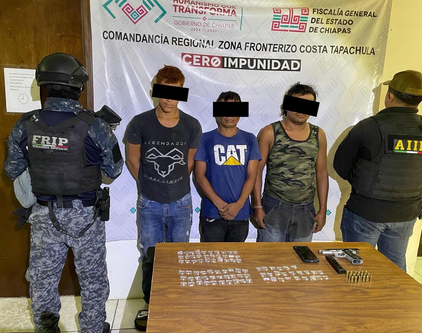 En operativo interinstitucional, la Secretaría de Seguridad del Pueblo (SSP), a través de la Fuerza de Reacción Inmediata Pakal (FRIP), en coordinación con la Agencia de Investigación e Inteligencia Ministerial (AIIM) de la Fiscalía General del Estado (FGE) y la Secretaría de Seguridad y Protección Ciudadana (SSPC) del Gobierno Federal, detuvieron a tres presuntos integrantes del crimen organizado por posesión de al parecer narcóticos y arma de fuego, en el municipio de Huixtla.