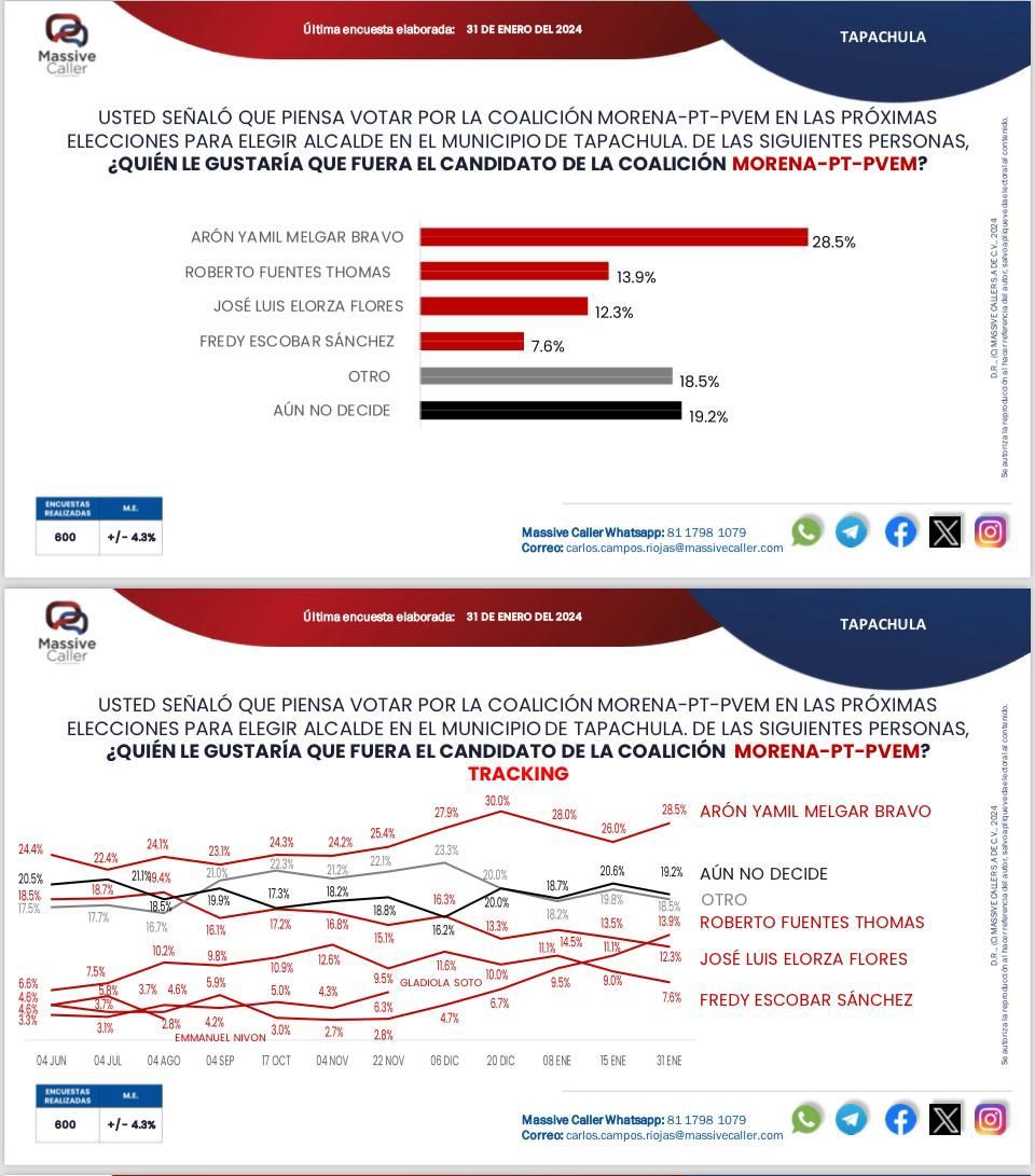 El candidato a la alcaldía de Tapachula por la coalición Morena – PT – PVEM, Arón Yamil Melgar Bravo, va a la cabeza en las preferencias electorales según la encuestadora Massive Caller, con un 28.5% de la intención del voto; el candidato en el segundo lugar tiene el 13.9%.